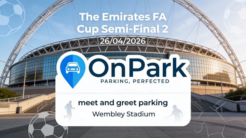 The Emirates FA cup Semi-Final 1 at Wembley 26/04/2026, convenient off-stadium Meet & Greet parking in a secure, designated lot. Event ticket not included. Drop-off and pick-up time slots may change (update) when the Kickoff time is confirmed.